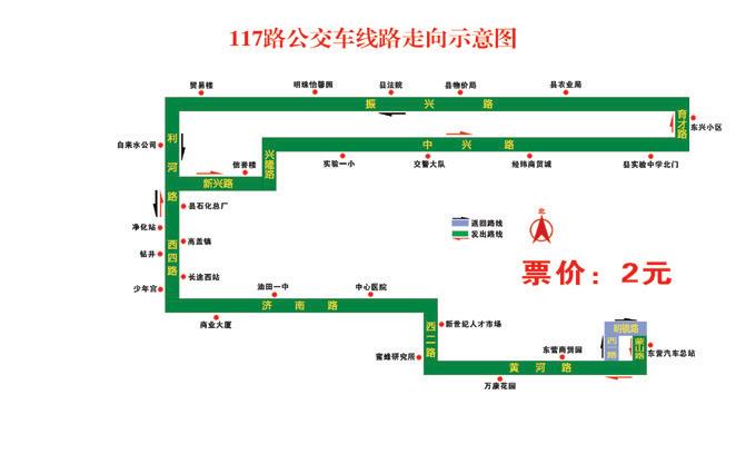 117路:自東營長途汽車總站始發(fā),途經(jīng)蒙山路、黃河路、西二路、濟南路、西四路、利河路、新興路、興隆路、中興路、育才路、振興路、利河路、西四路、濟南路、西二路、黃河路、西一路、明鏡路、蒙山路、到達終點站東營長途汽車總站,票價不變,仍為2元/人次;