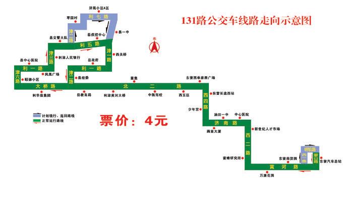 131路:自東營長途汽車總站始發(fā),途經(jīng)蒙山路、黃河路、西二路、濟南路、西四路、北二路、大橋路、津六路、利一路、津三路、利五路、津一路、利一路、津二路、大橋路、北二路、西四路、濟南路、西二路、黃河路、西一路、明鏡路、蒙山路、到達終點站東營長途汽車總站,票價不變,仍為4元/人次。