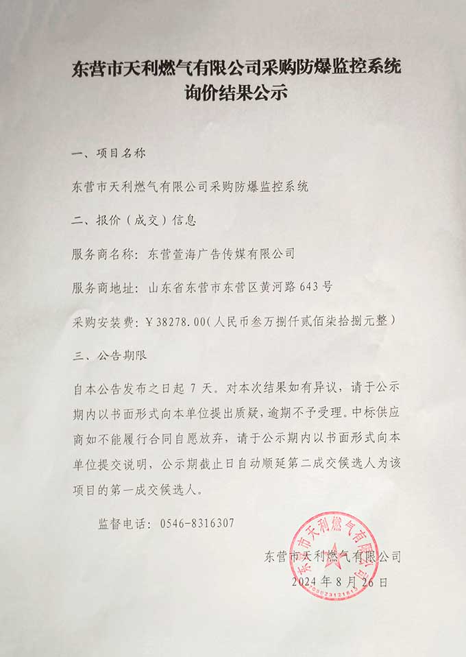 東營市天利燃氣有限公司采購防爆監(jiān)控系統(tǒng)