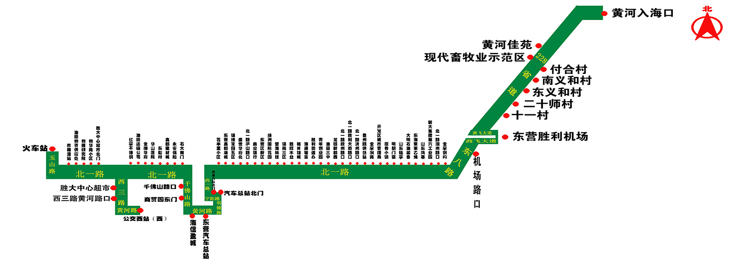下行自公交西站始發(fā),經(jīng)黃河路、西三路、北一路、玉山路(火車站調(diào)頭)、北一路、千佛山路、黃河路、明鏡路、寧陽路、西一路、北一路、東八路、商飛大道(勝利機場調(diào)頭)、東八路、228省道、024鄉(xiāng)道到達(dá)終點站“黃河入??凇保簧闲邪瓷鲜雎肪€返回。