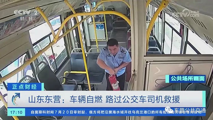 近日在東營,一輛正常行駛的車突然起火,而且是在車流量很大的道路中央。在等紅綠燈的東營公交駕駛員張學成和商衛(wèi)東看到這一情況后,紛紛拿起車上的滅火器參與救援。