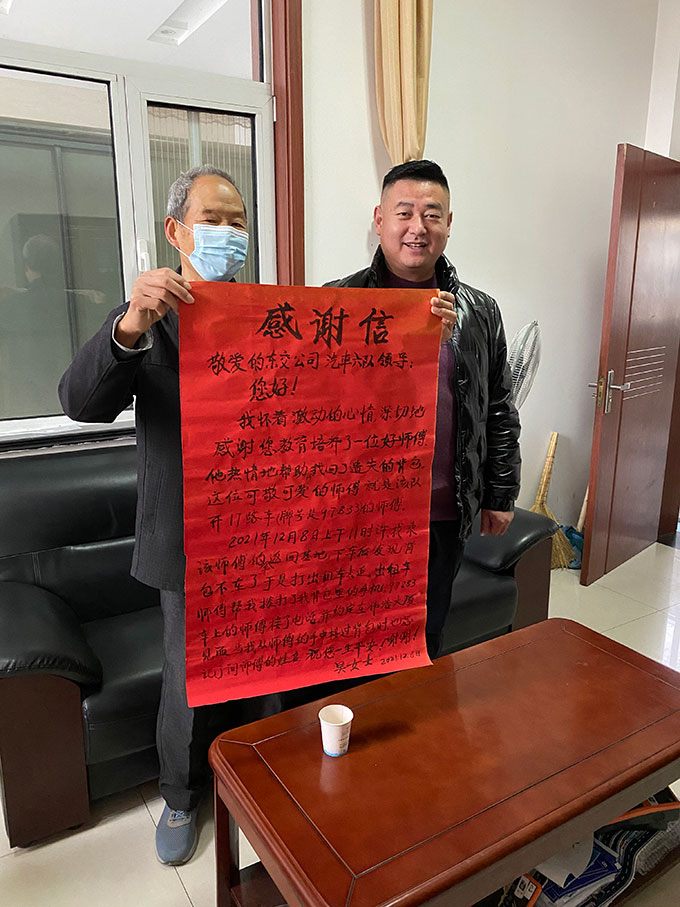 12月9日上午,東營(yíng)市公交公司汽車六隊(duì)的辦公樓里來了兩位手捧大紅色感謝信的老人家。上面寫著“感謝您教育培養(yǎng)了一位好師傅,他熱情地幫助并找回了遺失的背包?!?br/> 原來,在12月8日上午,家住西城的吳女士和老伴從墾利區(qū)返程時(shí)乘坐了袁永文師傅駕駛的117路公交車,在到達(dá)濟(jì)南路附近下車后,發(fā)現(xiàn)自己的隨身斜跨的背包不見了。這時(shí)才想到可能是遺落在剛剛的公交車上,“雖然是個(gè)小破包,里面也就一百來塊錢,可是手機(jī)、鑰匙、老年卡都在包里?!被叵肫甬?dāng)時(shí)發(fā)現(xiàn)背包丟失后的吳女士非常著急,“手機(jī)還是孩子剛給買的,還新得很呢”。焦急的吳女士便跑到附近的濱海派出所去詢問該如何,“人家給我出了個(gè)主意,打上出租車去追”。吳女士和老伴便急忙攔上了一輛出租車去追趕。吳女士說自己老伴平時(shí)出門也不帶電話,幸虧出租車駕駛員人也很好,用自己的電話撥打了吳女士背包里的手機(jī)。當(dāng)時(shí)還在駕駛車輛的袁永文師傅并不知道這一切,當(dāng)他聽到車廂內(nèi)有電話聲響,經(jīng)乘客提醒得知有個(gè)背包在座位上,考慮到可能是失主在尋找。袁師傅便在下一站把車??柯愤吅?,從包里拿出電話,撥了回去,這樣雙方才取得了聯(lián)系。