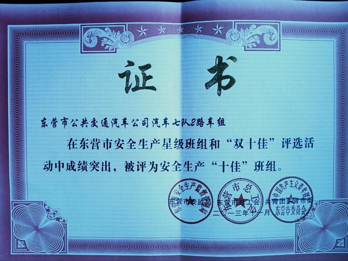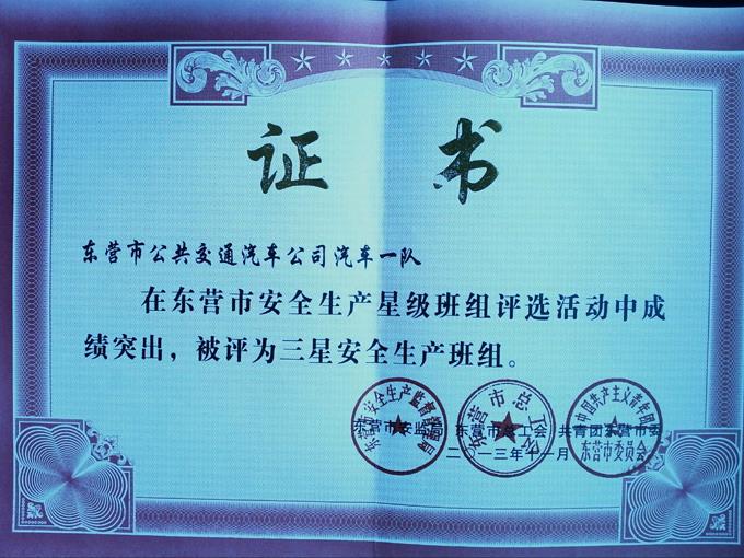 2012年開(kāi)始,市公交公司按照安全生產(chǎn)標(biāo)準(zhǔn)化要求,不斷完善、補(bǔ)充安全檔案資料,在今年市安全生產(chǎn)監(jiān)督管理局、市總工會(huì)、共青團(tuán)東營(yíng)市委組織的創(chuàng)建星級(jí)安全生產(chǎn)班組和十佳班組活動(dòng)中,市公交公司汽車一隊(duì)、汽車七隊(duì)2路車組分別被評(píng)為三星安全生產(chǎn)班組和安全生產(chǎn)十佳班組。