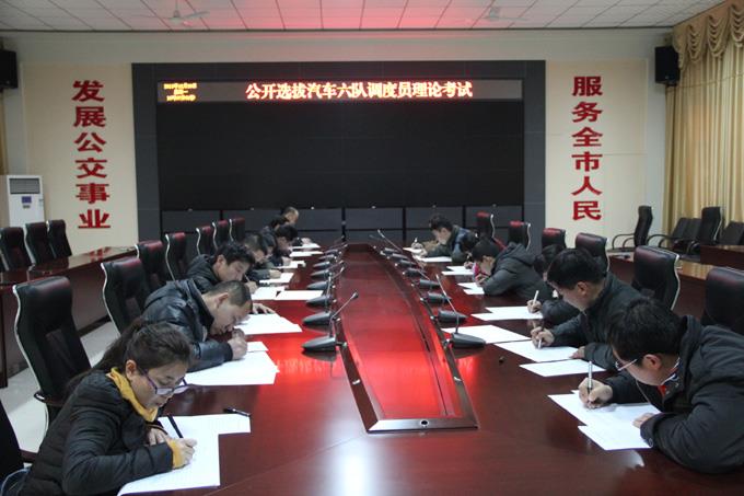 2013年12月底,市公交公司汽車六隊3名調(diào)度員公開選拔理論考試在公司一樓會議室開考,符合申報條件的15名員工,在規(guī)定時間內(nèi)按照給定的5個題目,圍繞調(diào)度職責(zé)、如何做好運營調(diào)度工作等相關(guān)內(nèi)容進行了認真答卷。本著公開、公正的原則,由公司領(lǐng)導(dǎo)班子、人事科長、所在車隊負責(zé)人組成的評委對密封試卷現(xiàn)場評分后,對理論成績排名前6名的同志當(dāng)場進行了民主評議。最后,張東衛(wèi)、張光輝、潘志紅3名同志理論成績、民主評議綜合得分排名居前三位。經(jīng)過3天公示無異議后,3名同志已于2014年1月3日到崗培訓(xùn)。