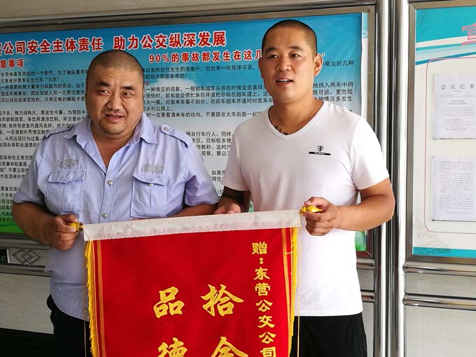 事后,失主拿著錦旗來到市公交公司汽車七隊,找到車隊領(lǐng)導(dǎo)和駕駛員,感謝拾金不昧的好司機---楊寶海。