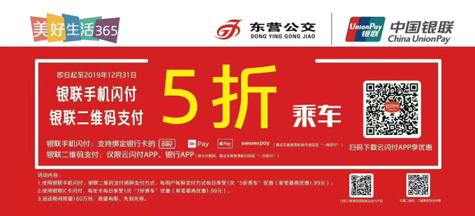 為倡導(dǎo)綠色低碳出行環(huán)境,讓市民充分享受到公交優(yōu)先發(fā)展的成果,自即日起至12月31日,市公交公司聯(lián)合銀聯(lián)再次推出便民服務(wù)舉措。市民使用銀聯(lián)手機(jī)閃付、云閃付APP二維碼或各銀行APP二維碼支付兩種支付方式,每用戶每種支付方式每天享受1次“5折乘車”優(yōu)惠(單筆最高優(yōu)惠1.99元);使用銀聯(lián)IC卡閃付每卡每天享受1次“7折乘車”優(yōu)惠?;顒?dòng)期間優(yōu)惠總額160萬(wàn)元,先到先得,滿額為止。
