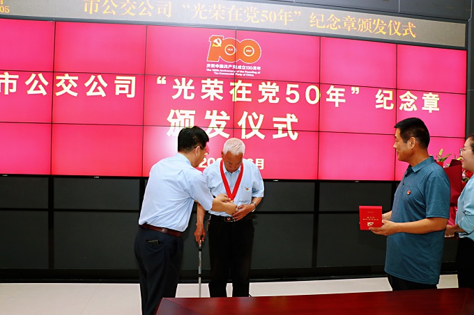 6月24日上午,在中國共產(chǎn)黨成立100周年即將到來之際,東營公交組織開展了“光榮在黨50年”紀(jì)念章頒發(fā)儀式。公司黨委書記趙龍、經(jīng)理劉海、副經(jīng)理孫紅光、景洪培和黨齡50周年老黨員以及黨員代表等參加了頒發(fā)活動(dòng)。