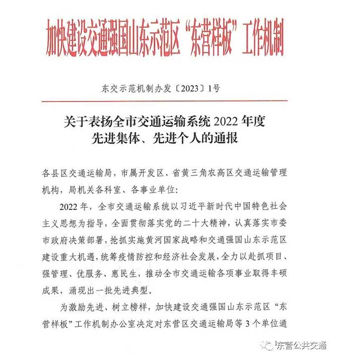 會(huì)上,加快建設(shè)交通強(qiáng)國(guó)山東示范區(qū)“東營(yíng)樣板”工作機(jī)制辦公室印發(fā)了2022年度全市交通運(yùn)輸工作交通先鋒先進(jìn)集體及先進(jìn)個(gè)人表彰決定。市公交公司、市公交公司辦公室、市公交公司保修二廠獲得交通先鋒先進(jìn)集體榮譽(yù)稱號(hào),2名同志獲得交通先鋒先進(jìn)個(gè)人榮譽(yù)稱號(hào)。