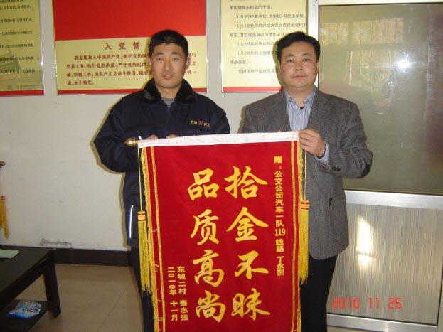 11月25日上午,齊潤(rùn)化工廠的秦志強(qiáng)先生拿著一面寫有“拾金不昧、品質(zhì)高尚”的錦旗來到市公交公司汽車一隊(duì),感謝119路駕駛員丁永國師傅拾金不昧的高尚品德。據(jù)車隊(duì)了解得知,11月24日,秦先生的母親在齊潤(rùn)化工廠丁莊駐地領(lǐng)取完1000元的“孝心取暖費(fèi)”后,乘坐119路返回東城,回家后發(fā)現(xiàn)現(xiàn)金不見了,抱著試試看的想法來到汽車一隊(duì)詢問得知,駕駛員丁永國師傅已將現(xiàn)金1029元上繳車隊(duì)等待失主認(rèn)領(lǐng)。秦先生告訴車隊(duì)領(lǐng)導(dǎo),他的母親患有高血壓病史,現(xiàn)金丟失后老人心急如焚,當(dāng)時(shí)就癱坐在車隊(duì)辦公室內(nèi),幸虧車隊(duì)的田隊(duì)長(zhǎng)熱情接待,及時(shí)核對(duì)情況后,將錢物如數(shù)歸還并將老人安全地送到回家的車上。