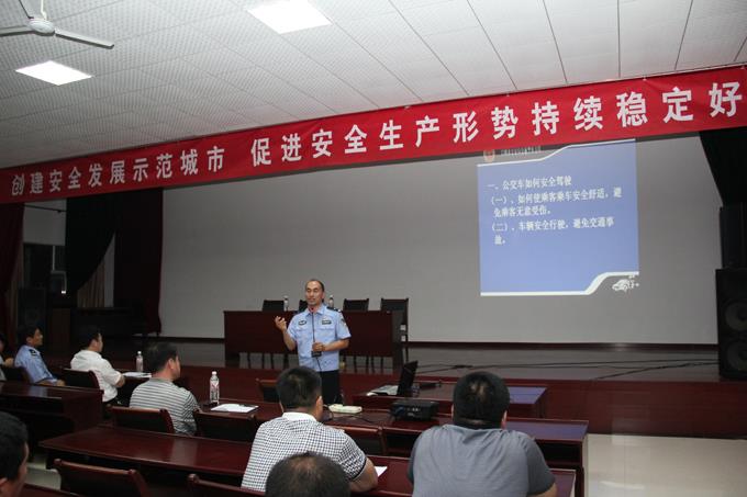 2012年5月30日晚,“創(chuàng)建安全發(fā)展示范城市,促進(jìn)安全生產(chǎn)形勢(shì)持續(xù)穩(wěn)定好轉(zhuǎn)”安全講座走進(jìn)市公交公司活動(dòng)在我單位大會(huì)議室舉行,車隊(duì)安全管理人員和部分一線駕駛員以及后勤職能科室相關(guān)人員聽(tīng)取了由市交警支隊(duì)宣傳科劉井泉科長(zhǎng)、姜濤副科長(zhǎng)和交警一大隊(duì)宣傳中隊(duì)陳新建中隊(duì)長(zhǎng)講解的安全知識(shí)講座。講座分別圍繞開(kāi)展六月份“安全生產(chǎn)月”活動(dòng)的重要性、公交車安全駕駛常識(shí)、駕駛員安全管理、案例分析和觀看幻燈片等方面進(jìn)行。